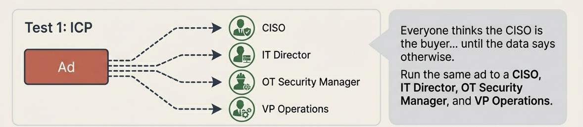 Everyone thinks the CISO is the buyer… until the data says otherwise. Run the same ad to different roles—CISO, IT Director, OT Security Manager, VP Operations—and compare results. You might discover the real buyer isn’t who your sales deck thinks it is. LinkedIn’s targeting granularity makes it uniquely suited for this test. According to LinkedIn’s own B2B Institute research, the average enterprise technology purchase involves 6 to 10 stakeholders, and the person who initiates vendor research is often not the budget holder. In industrial cybersecurity, engineering and operations titles frequently drive the shortlist before procurement or the C-suite ever gets involved. A well-structured ICP test on LinkedIn—same ad creative, same landing page, different audience segments—can reveal which roles engage, which roles convert, and which roles amplify your content to others. That data is worth more than any persona document built in a conference room.