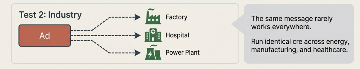 The same cybersecurity message rarely works everywhere. Run the same creative across different industries—energy, manufacturing, healthcare—and watch the results. The verticals that convert best are often where your product naturally resonates. Even when the underlying technology is identical, the regulatory context, threat landscape, and operational priorities differ dramatically across verticals. A message about compliance resonates differently in healthcare (HIPAA, HITECH) than in energy (NERC CIP) than in manufacturing (no federal mandate at all, so ROI-framing tends to win). According to Forrester, 74% of B2B buyers say they expect vendor communications to be personalized to their industry—and only 36% say they regularly receive messaging that meets that bar. Industry segmentation in paid campaigns lets you quickly identify where your generic message is already landing and where it needs to be localized. High performers in one vertical are often strong signals for an industry-specific content or ABM investment.