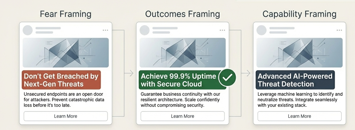 Cybersecurity marketers love fear-based messaging, but buyers don’t always respond to it. Run identical ads with different headline frames—fear, outcomes, or capability—and see which gets the highest click-through rate. The winning headline often reveals the real pressure driving your buyer’s decisions. A 2023 Gartner study found that B2B technology buyers are 1.5x more likely to engage with content that emphasizes business outcomes over technical capabilities—yet the majority of cybersecurity ads still lead with threat language. Fear works when the threat feels imminent and personal; it backfires when buyers are fatigued or already desensitized. In OT and industrial security, where audiences have lived through years of “the sky is falling” headlines, outcome-framing like “keep production running” consistently outperforms fear-framing in head-to-head tests. Run at least three variants, let each accumulate 500+ impressions before drawing conclusions, and resist the urge to call a winner too early.