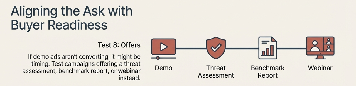 If your demo ads aren’t converting, it might not be your demo—it might be timing. Try running campaigns offering a threat assessment, benchmark report, or webinar instead. The offer that converts tells you how ready your audience actually is to buy. Demand Gen Report’s 2023 B2B Buyer Survey found that 62% of buyers engage with three to seven pieces of content before speaking to a vendor. Pushing a demo to a cold audience is like proposing on a first date. Testing softer offers—educational content, diagnostic tools, peer benchmarks—helps you understand where the majority of your addressable market actually sits in the funnel at any given time. In industrial cybersecurity, where procurement cycles routinely run 12–18 months, the ability to capture and nurture early-stage buyers is a significant competitive advantage. The offer test is also a proxy for audience intent: what someone is willing to give their email for tells you a lot about what they’re trying to solve right now.