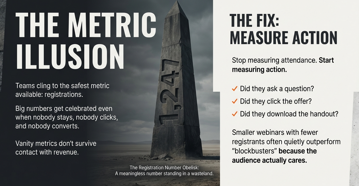 Instead, registrations become the shorthand for success. A large number creates reassurance, even if half the audience disengaged halfway through. Volume is easy to report. Depth requires reflection. Downstream, though, the difference becomes obvious. A smaller group that stayed engaged and asked thoughtful questions almost always produces more meaningful conversations than a crowd that simply clicked “register.”