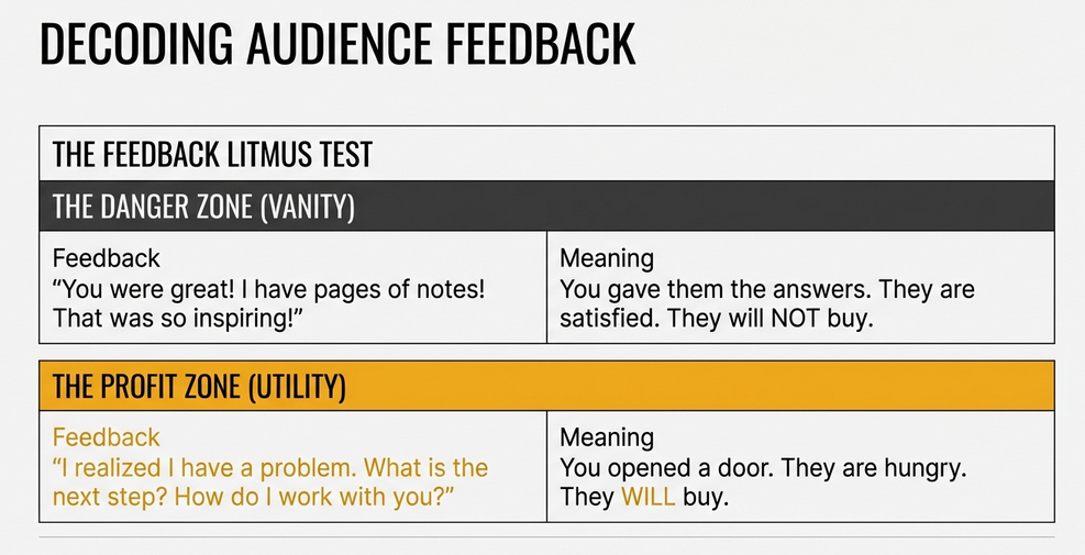 Great speakers balance education with opportunity. They meet their responsibility to inform and inspire, but they also reshape how the audience sees its own challenges. When done well, the presentation naturally creates demand.